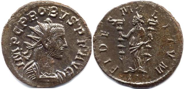 Reverse Legend : FIDES MILITVM Reverse Type : Fides standing left, holding two ensigns Obverse Legend : IMP C M AVR PROBVS AVG Bust Type : Radiate, cuirassed bust right References : RIC 28 Bust Type F (Rated Common), Cohen 256, Bastien 168 (32 ex.)