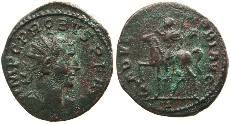 Reverse Legend : ADVENTVS PROBI AVG Reverse Type : Emperor. riding left, right hand raised, left holding sceptre; at foot, captive Obverse Legend : IMP C PROBVS . P . F . AVG Bust Type : Radiate, cuirassed bust right References : RIC 19 Bust Type F (Rated Common), Cohen 68, Bastien 184 (10 ex.)