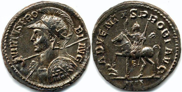 Reverse Legend : ADVENTVS PROBI AVG Reverse Type : Emperor riding left, right hand raised, left holding sceptre; at foot, captive Obverse Legend : IMP C M AVR PROBVS AVG Bust Type : Radiate, helmeted, cuirassed bust left, holding spear and shield References : RIC -, Cohen 62, Bastien 255 (1 ex.) NO EXAMPLE YET