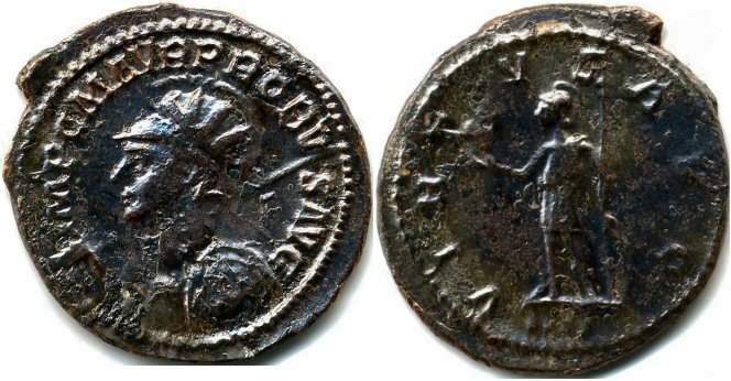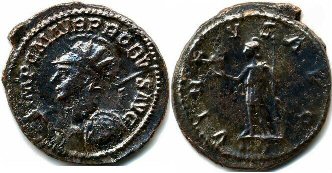 Same reverse legend and type Obverse Legend : VIRTVS PROBI AVG Bust Type : Radiate, helmeted, cuirassed bust left, holding spear and shield References : RIC 64 (Rated Scarce), Cohen 69, Bastien 256 (2 ex.)