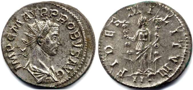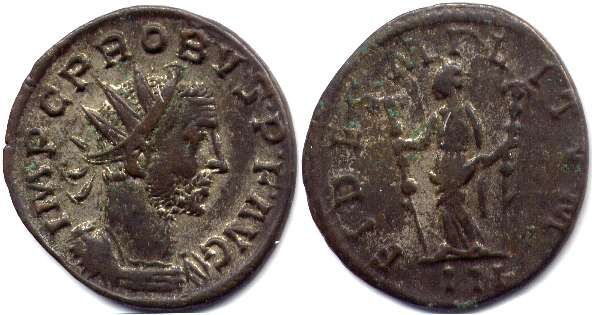 Reverse Legend : FIDES VICTOR (sic) Reverse Type : Fides standing left, holding two ensigns Obverse Legend : IMP C M AVR PROBVS AVG Bust Type : Radiate, cuirassed bust right References : RIC 30 Bust Type F (Rated R3), Cohen 267, Bastien 289 (2 ex.) NO EXAMPLE YET