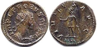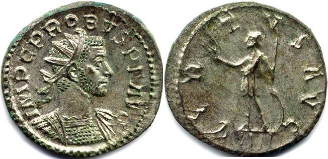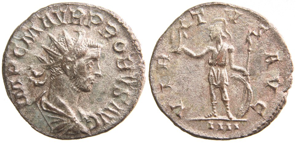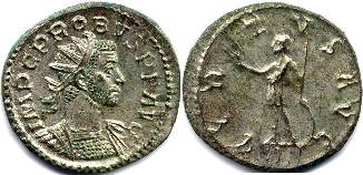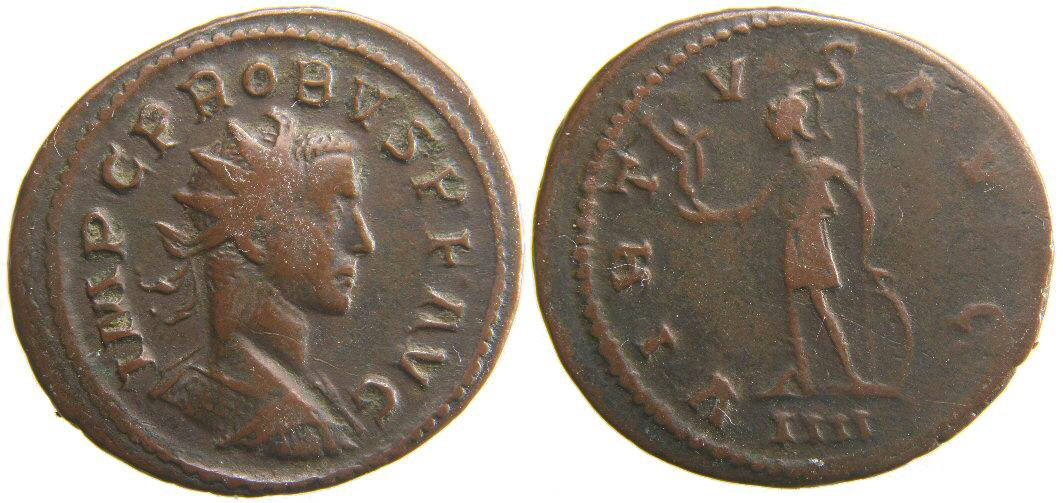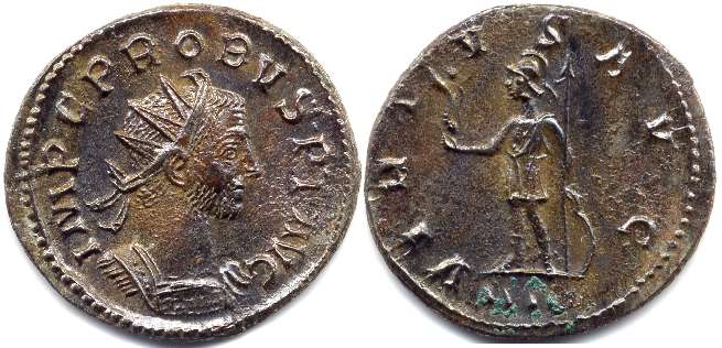 Reverse Legend : VIRTVS AVG Reverse Type : Soldier standing left, holding Victory and spear, left hand on shield Obverse Legend : IMP C M AVR PROBVS AVG Bust Type : Radiate, cuirassed bust right References : RIC 111 Bust Type F (Rated Common), Cohen 819, Bastien 296 (8 ex.) NO EXAMPLE YET