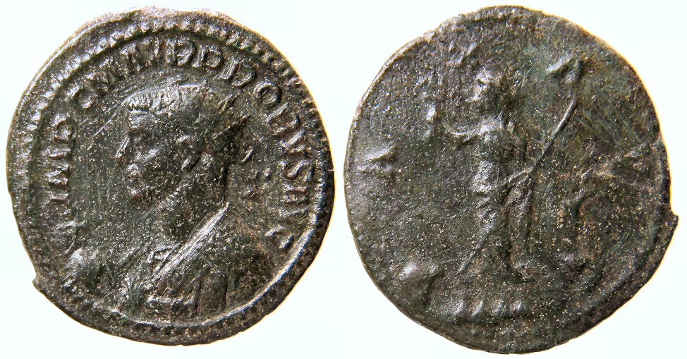 Reverse Legend : PAX AVG Reverse Type : Pax standing left, holding olive-branch and sceptre Bust Type : Radiate bust left wearing imperial mantle, holding Victory on globe in right hand References : RIC -, Cohen -, Bastien 341 (3 ex.)