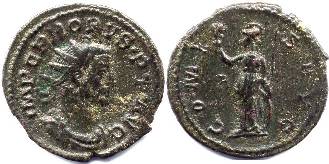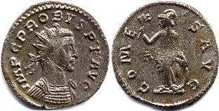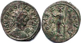 Reverse Legend : VIRTVS AVG Reverse Type : Emperor riding right, holding a spears; at foot, captive, both hand bound behind back Obverse Legend : VIRTVS PROBI AVG Bust Type : Radiate, helmeted, cuirassed bust left, holding spear and shield Officina Mark Position : Centre field References : RIC -, Cohen 848, Bastien 371 (1 ex.) NO EXAMPLE YET